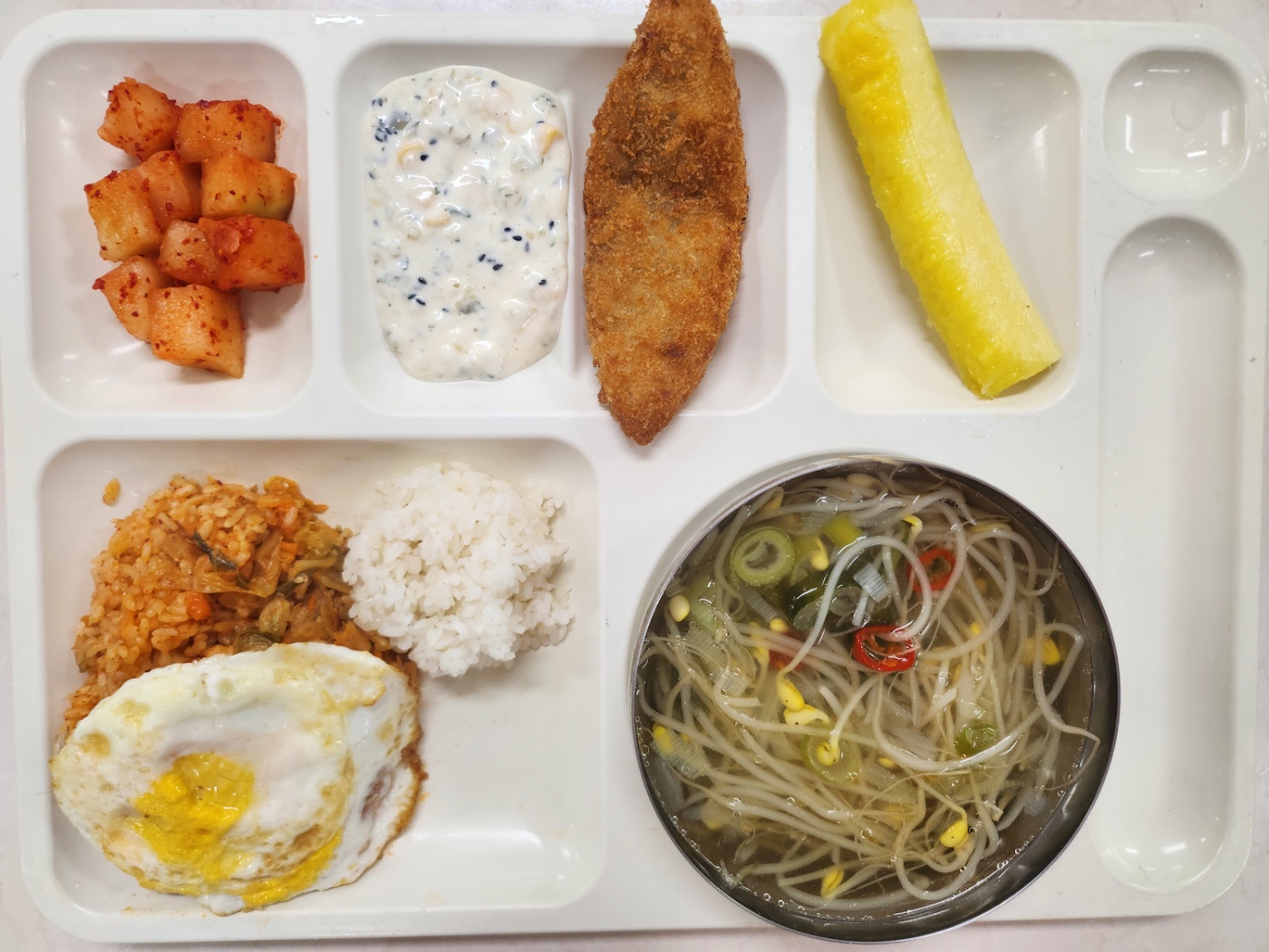 김치볶음밥(1.2.5.6.9.10.15.16) 친환경콩나물국1(5.6.8.9.18) 생선까스+콘타르소스(1.5.6.13) 계란후라이(친환경)(1) 깍두기(9) 골드파인애플스틱