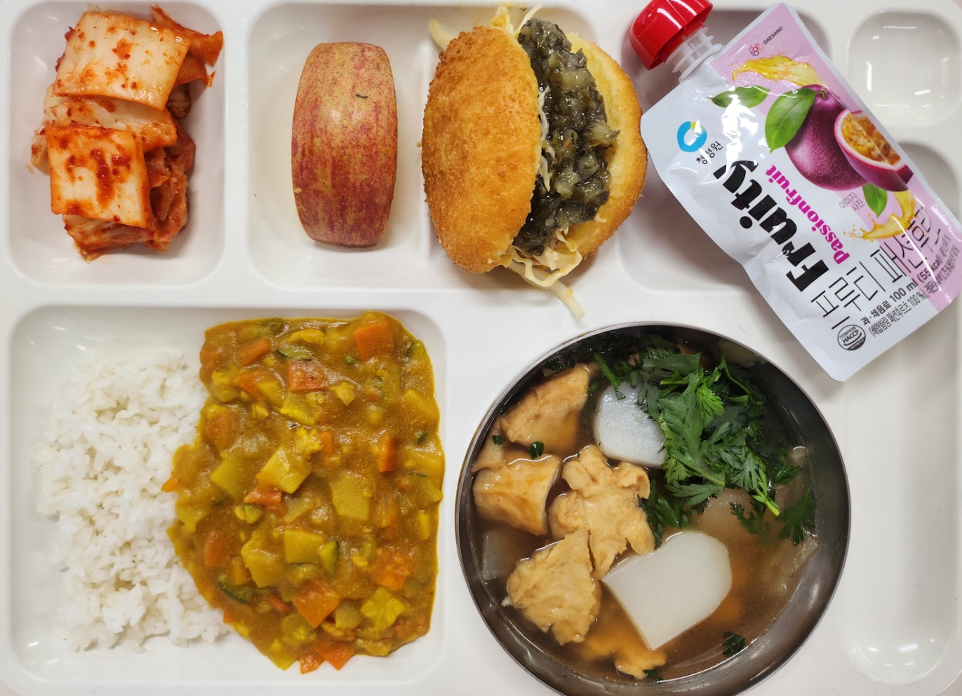돈육카레라이스(2.5.6.10.12.13.16) 모듬쑥갓어묵국(1.5.6.8.9.13.18) 불고기쏙고로케(2.12) 배추김치(완제)(9) 패션후르츠음료100ml(13) 사과(부사)