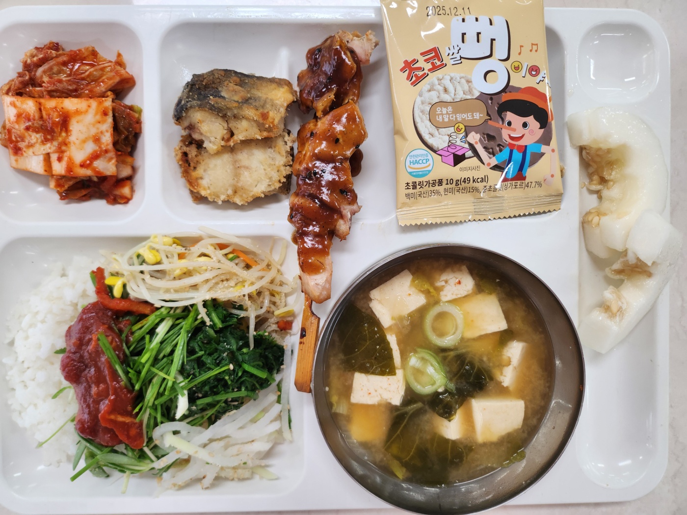 봄나물비빔밥+고추장양념(5.6.10.13) 두부된장국(5.6.8.9.18) 양념닭꼬치100g(5.6.13.15) 임연수어구이1자율(5.6) 배추김치(완제)(9) 초코쌀뻥과자(1.2.5.6) 파파야멜론(지원센터)