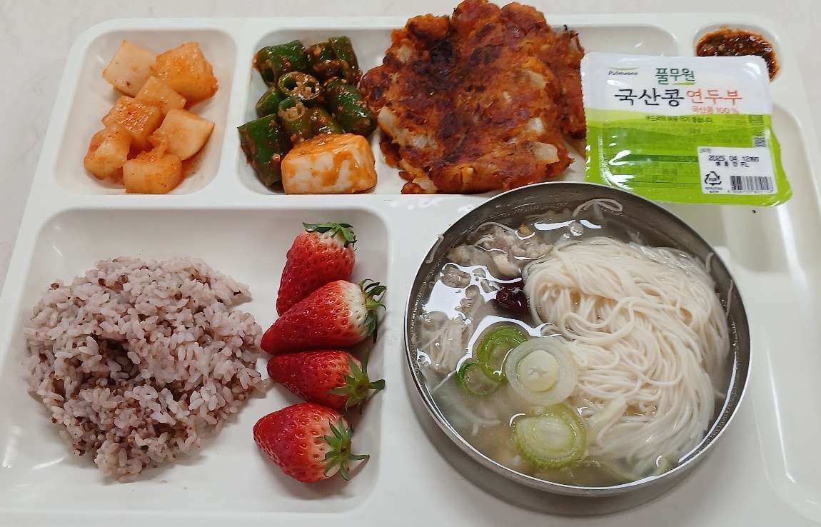 수수밥 영양닭곰탕1(6.15) 연두부양념장(5.6) 오징어김치전(5.6.9.17) 깍두기(9) 딸기 아삭고추된장무침(5.6)