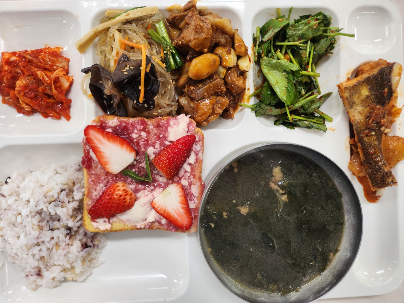 혼합잡곡밥(5) 딸기오픈샌드위치(2.5.6.13) 한우미역국(5.6.8.9.16.18) 가자미조림(자율)(5.6.13) 참나물무침1 한식잡채24(1.5.6.10.13) 돈육갈비구이(24년)(5.6.10.12.13) 배추김치(완제)(9)