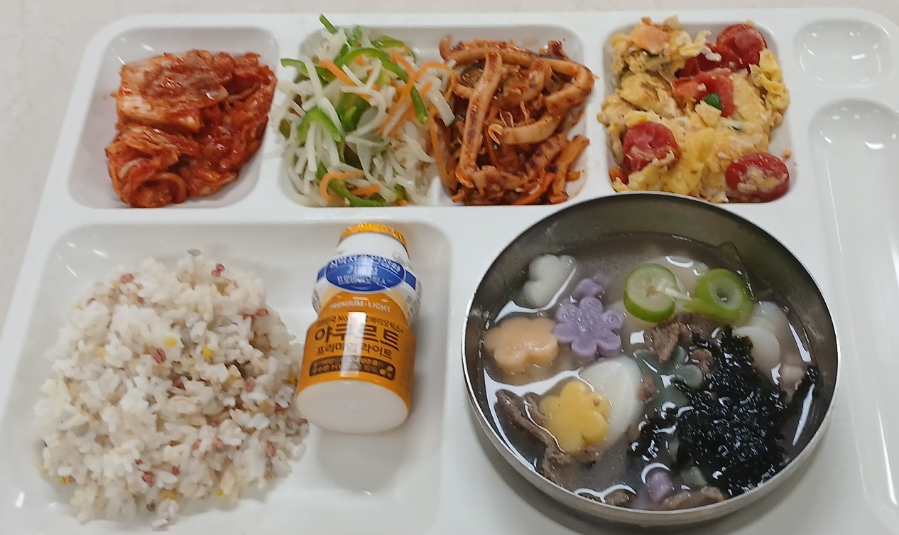 보리밥 꽃떡국(소)(1.8.9.16.18) 오징어채소볶음(5.6.13.17) 감자채볶음 맛살스크램블1(1.5.6.8) 배추김치(완제)(9) 야구르트100ml(저당)(2)