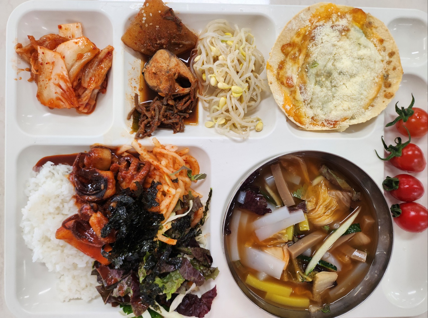 고등어무조림(자율)(7.13) 콩나물무침(5) 불맛주꾸미덮밥(5.6.12.13) 또띠아콘피자(채식수제)(1.2.5.6) 배추김치(완제)(9) 대추방울토마토(지원센터24)(12)
