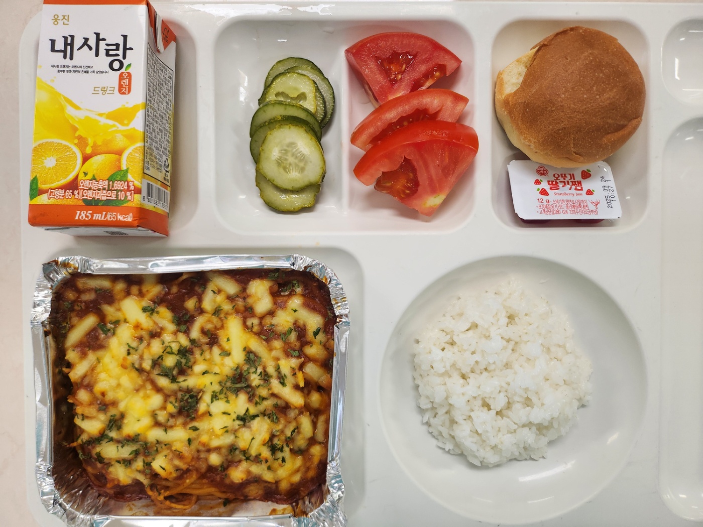 자율밥 오븐스파게티(1.5.6) 토마토절임(12.13) 오이피클 우리밀모닝빵+딸기잼(1.2.5.6.13) 오렌지음료185ml(13)