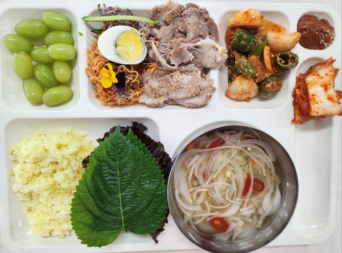 강황찹쌀밥 친환경콩나물국1(5.6.8.9.18) 수육/친환경상추(5.6.10) 비빔면24년(1.2.3.5.6.10.15.16) 배추김치(완제)(9) *모듬쌈(깻,케,당,상)(자율) 청포도(수입산) *궁채장아찌(자율/제조)(5.6.13) 아삭고추된장무침(5.6)