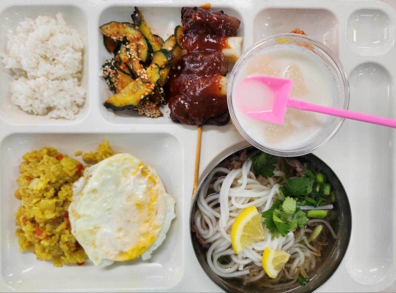 꿍팟퐁커리볶음밥(2.5.6.9.12.13.16.18) 자율밥 베트남쌀국수(미니)(5.6.15.16.18) 오이생채(13) 갈떡꼬치구이+소스(5.6.10.12.13.15.16) 배추김치(완제)(9) 망고사고24년(수제)(2.11)