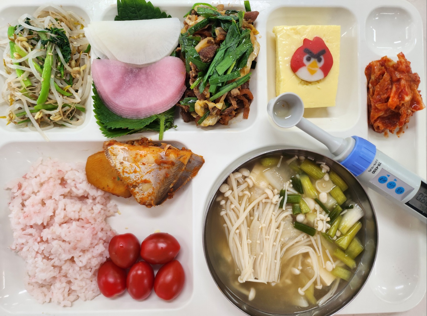 홍국쌀밥 팽이버섯된장국(5.6.8.9.18) 병어조림(자율) 일식계란찜24(어묵)(1.5.6.13) 미나리숙주나물 오리불고기*쌈무(5.6.13) 배추김치(완제)(9) 대추방울토마토(지원센터24)(12)