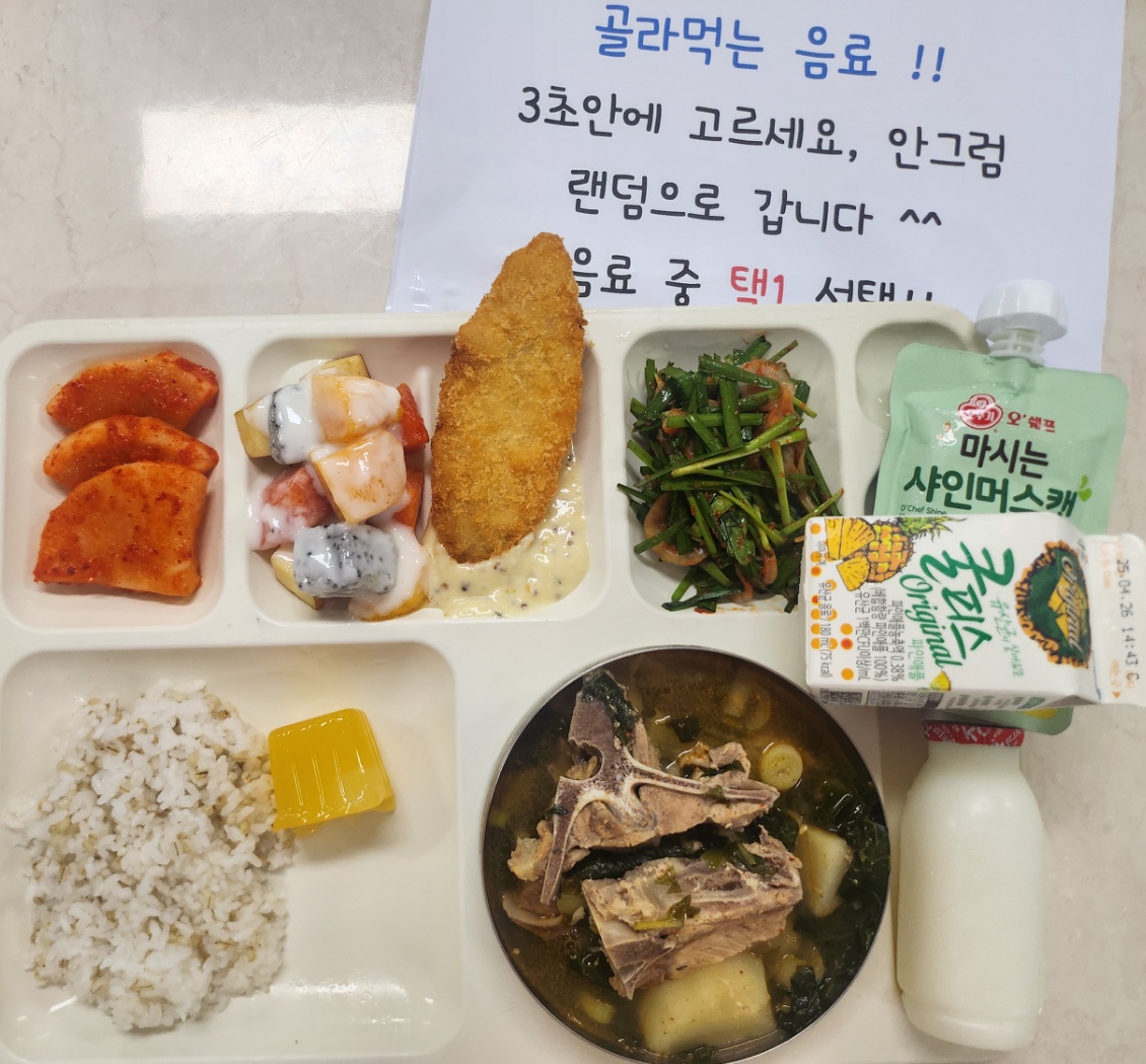 보리밥 등뼈감자탕1(10) 열대과일샐러드(요거트)(1.2.5.6) 생선까스+칠리소스24(1.5.6.12.13) 석박지(9) 부추겉절이 애플망고푸딩50g(벌크)