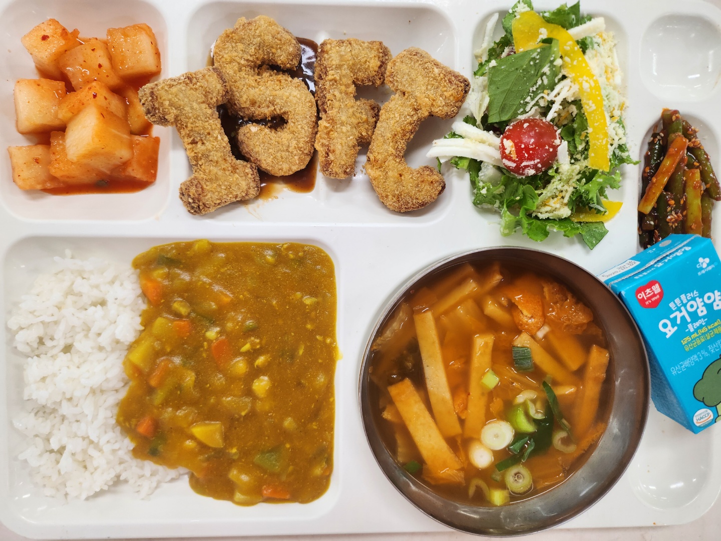 돈육카레라이스(2.5.6.10.12.13.16) 김치유부채어묵국(1.5.6.8.9.18) 마늘쫑고추장(5.6.13) 로메인샐러드(1.2.5.6.12) 알파벳돈까스+소스(1.5.6.10) 깍두기(9) 플레인음료(요거얌얌)(13)