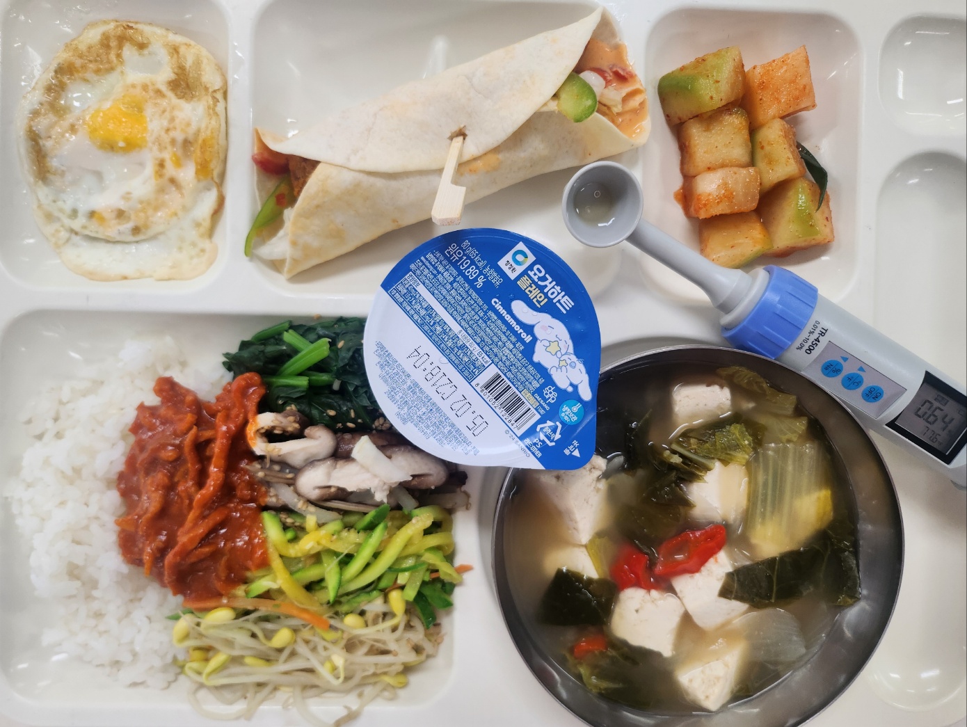 나물비빔밥+고추장(5.6.10) 새우또띠아(1.5.6.9.12.13) 두부된장국(5.6.8.9.18) 계란후라이(친환경)(1) 깍두기(9) 요거플레인(호상)80g(2)