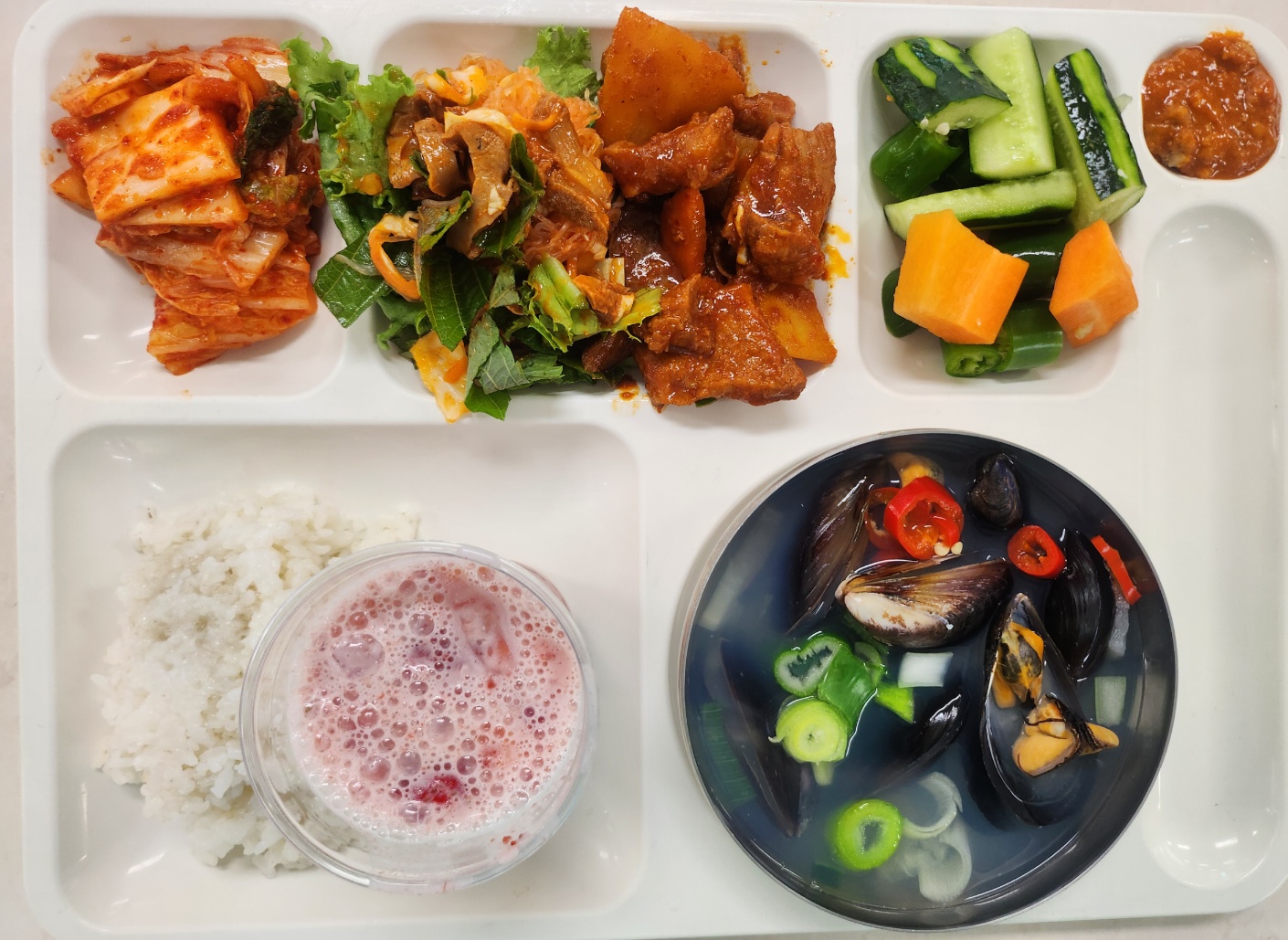가바찹쌀밥 시원칼칼한홍합탕(8.9.18) 매콤돼지갈비찜1(5.6.10.13) 골뱅이실곤약채소무침(5.6.13) 배추김치(완제)(9) 딸기라떼(2.13) 야채스틱(오이,당근,아삭고추)쌈장(5.6)