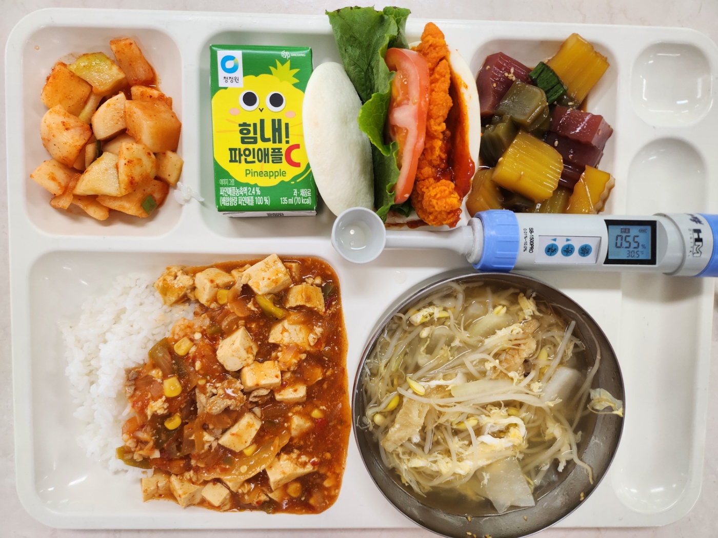 청포묵양념장(5.6) 마파두부덮밥(5.6.10.12.13.18) 마라바오버거25년(1.2.5.6.12.13.15) 깍두기(9) 파인애플주스(힘내)135ml(13)