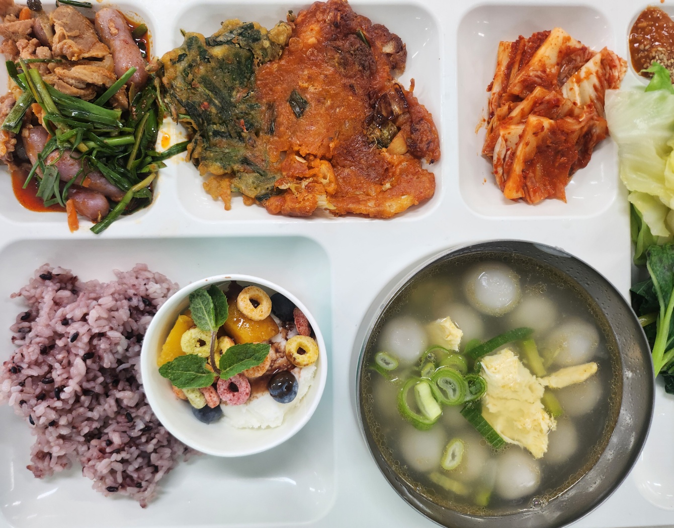 검정쌀밥 옹심이만두국(1.8.9.17.18) *머위쌈(자율) 양배추찜+쌈장(자율)(5.6) 오리불고기(5.6.13) 반반전(김치+부추)(5.6.9.17.18) 배추김치(완제)(9) 요아정(1.2.5.6.13)