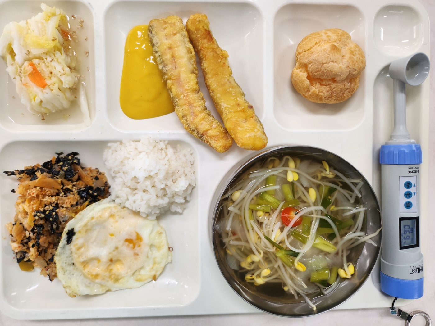김치볶음밥(1.2.5.6.9.10.15.16) 친환경콩나물국1(5.6.8.9.18) 롱오징어튀김(1.2.5.6.17) 계란후라이(친환경)(1) 백김치(완)(9) 아이스슈(딸기생크림)(1.2.5)