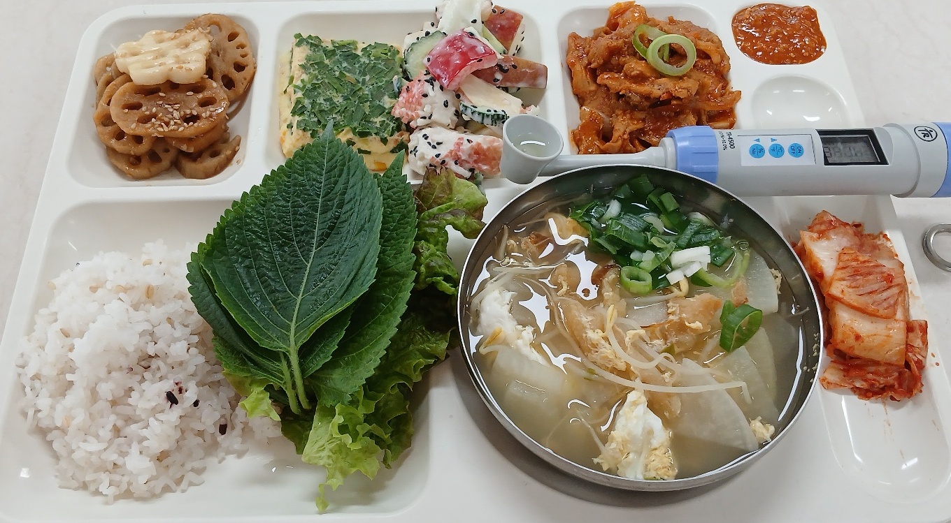혼합잡곡밥(5) 황태콩나물국(1.5.6.8.9.18) 연근곤약조림(자율)(5.6.13) 맛살야채계란찜1(1.5.6.8) 꽃맛살샐러드(1.2.5.6.8.18) 제육불고기+채소쌈(5.6.10.13) 배추김치(완제)(9)