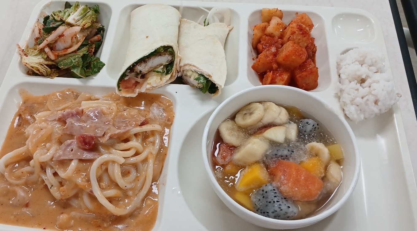 자율밥 수제치킨스넥랩(1.2.5.6.12.13.15.18) 단배추겉절이(13) 베이컨크림프렙우동(5.6.10.12.13) 깍두기(9) 열대과일화채23년3월(11.13)