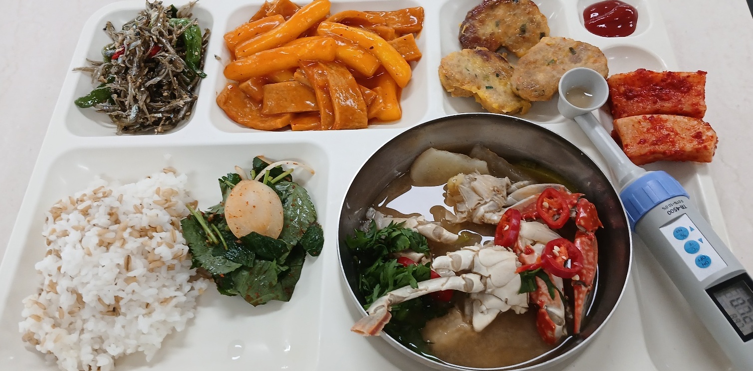 귀리쌀밥 꽃게된장국1(5.6.8.9.18) 참나물겉절이(13) 로제뉴진면볶이(1.5.6.12.13) 꽈리고추멸치볶음(5.6.13) 심쿵해땡(하트땡전)(1.2.5.6.10.12.15.16) 총각김치(9)