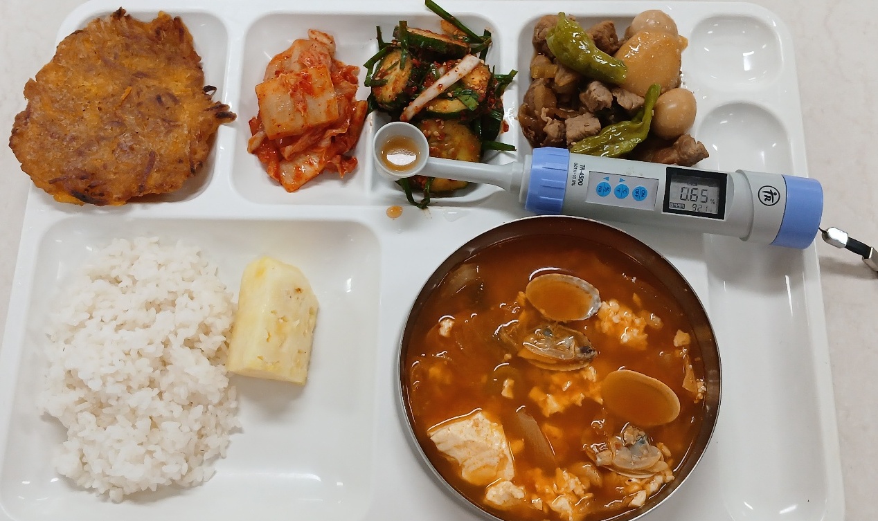 찹쌀밥 순두부국1(5.8.9.10.18) 모듬장조림1(1.5.6.10.13) 오이부추무침(13) 단호박전(5.6) 배추김치(완제)(9) 골드파인애플스틱