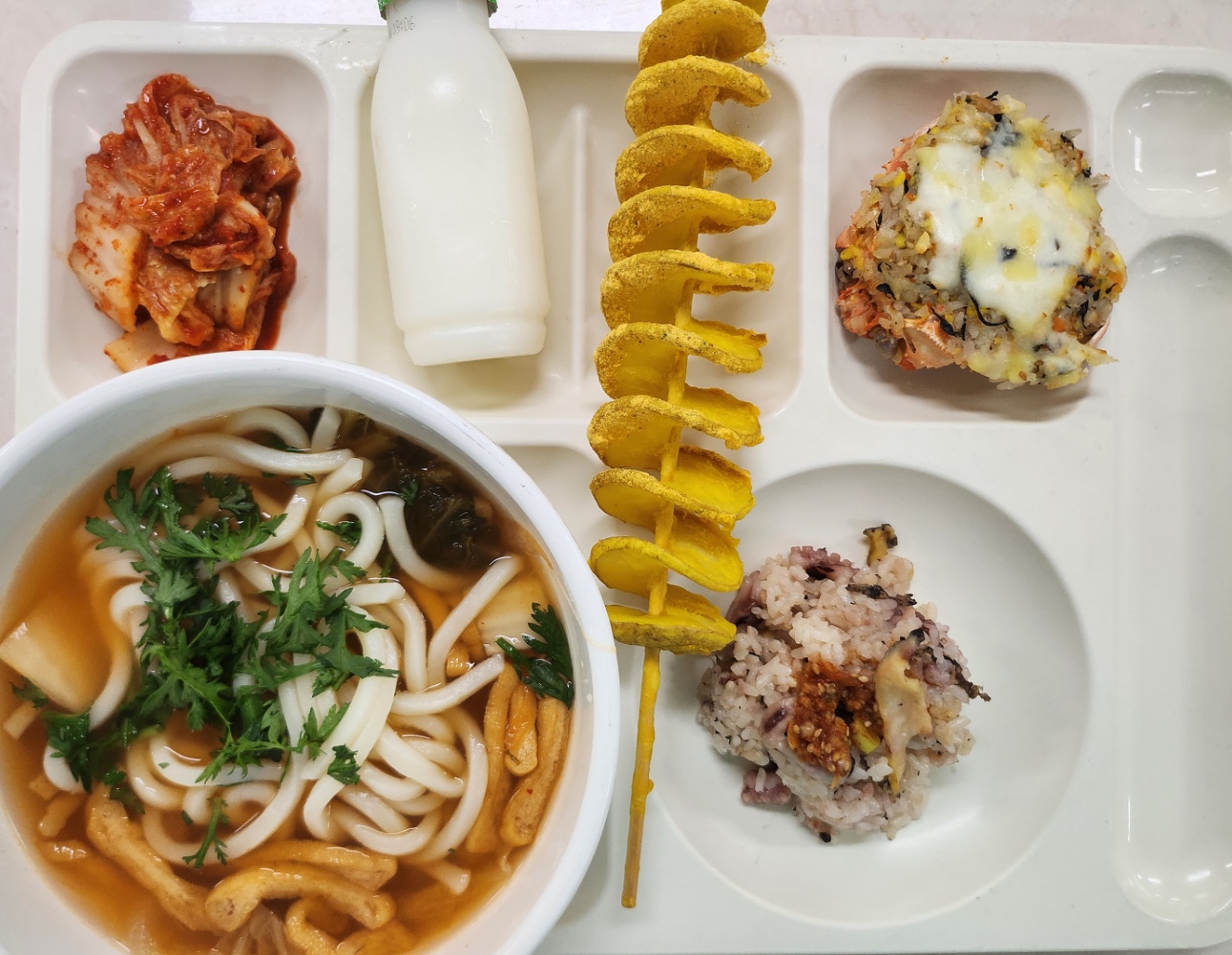 붉은대게살치즈그라탕(1.2.5.6.8.9.13.16.18) *전복낙지솥밥(자율)(18) 김치유부우동(1.5.6.8.9.18) 회오리감자