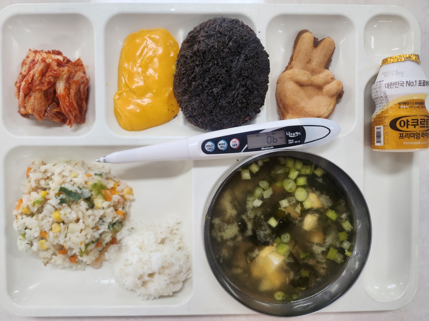 야채새우볶음밥(9) 묵찌빵(슈크림)(1.2.5.6) 미소장국(5.6.8.9.18) 블랙치킨까스+치즈소스(1.2.5.6.15.18) 배추김치(완제)(9) 야구르트100ml(저당)(2)