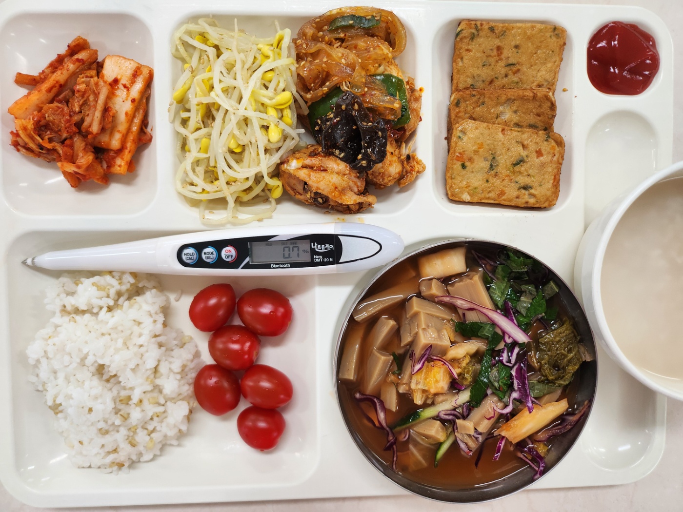 숭늉(자율)보리밥 도토리냉국(냉)(5.6.8.9.16.18) 콩나물무침 마라샹궈찜닭(납작당면)(2.5.6.10.13.15.16) 매콤어두부전+케첩(1.5.6.12) 배추김치(완제)(9) 대추방울토마토(지원센터24)(12)