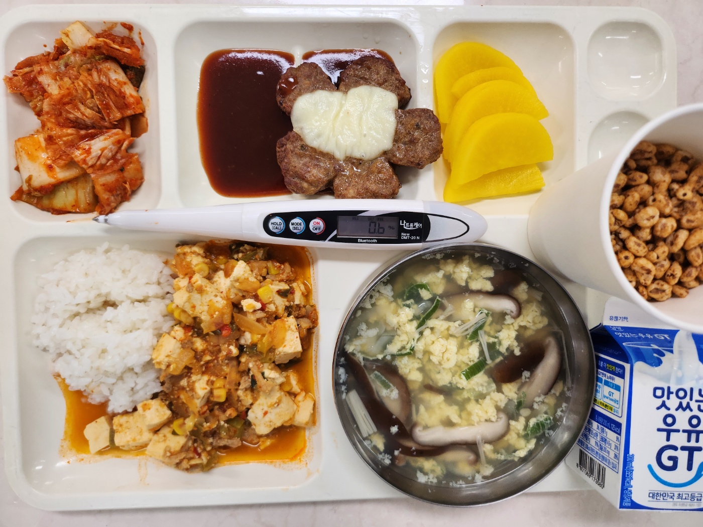 버섯계란탕(1.8.9.18) 마파두부덮밥(5.6.10.12.13.18) 활짝핀떡갈비(5.6.10.12.13.15.16.18) 배추김치(완제)(9) 단무지 죠리퐁아이스크림(라떼)(1.2.5)