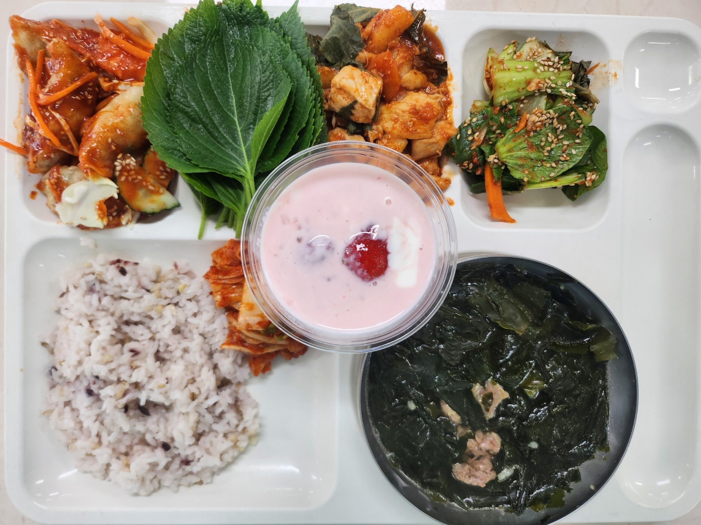 혼합잡곡밥(5) 한우미역국(5.6.8.9.16.18) 청경채겉절이(5.6.13) 춘천식닭갈비(5.6.13.15) 비빔만두(1.5.6.10.13.16.18) 배추김치(완제)(9) 딸기사고요거트(1.2)