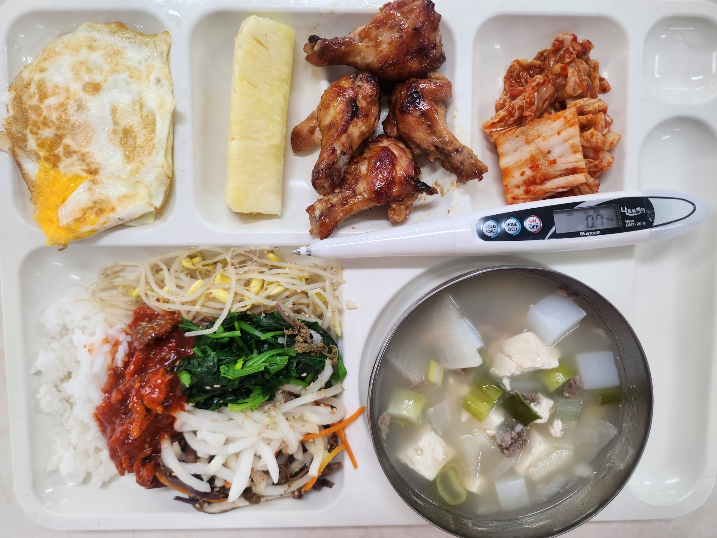 나물비빔밥+고추장(5.6.10) 쇠고기탕국(5.8.9.13.16.18) 닭봉오븐구이(3개)(5.6.12.13.15) 달걀후라이(1.5) 배추김치(완제)(9) 골드파인애플스틱