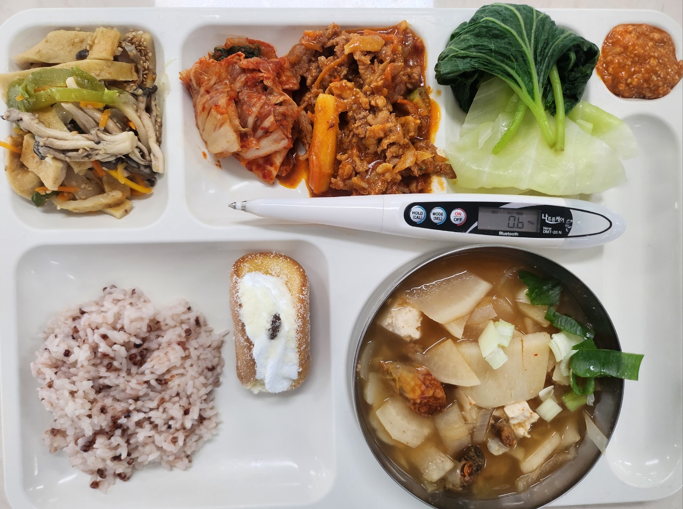 수수밥 미더덕된장국(5.6.8.9.18) *머위쌈(자율) 양배추찜+쌈장(자율)(5.6) 사각어묵채느타리볶음(1.5.6.13) 돈육불고기1(5.6.10.13) 배추김치(완제)(9) 생크림오믈렛(완제품)(1.2.5.6)