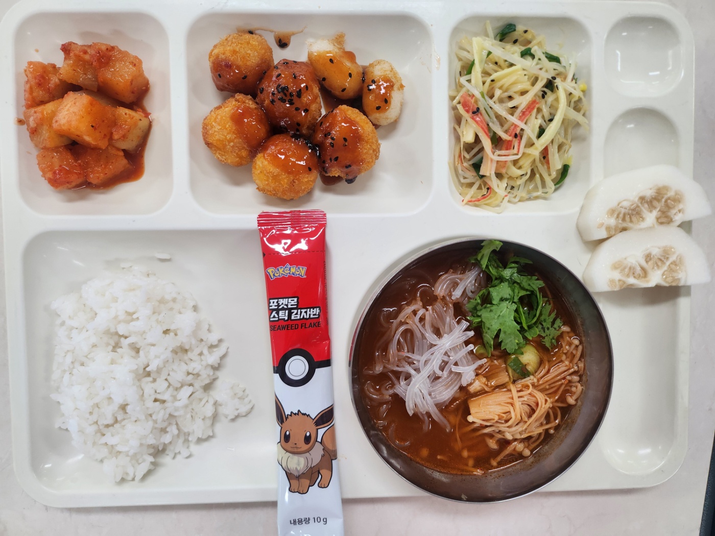 백미밥 와촌돼지찌개(10) 콩나물맛살냉채(1.2.5.6.13) 통살새우볼떡강정(1.2.5.6.9.12.13) 깍두기(9) 참외(지원센터) 김자반스틱(5)