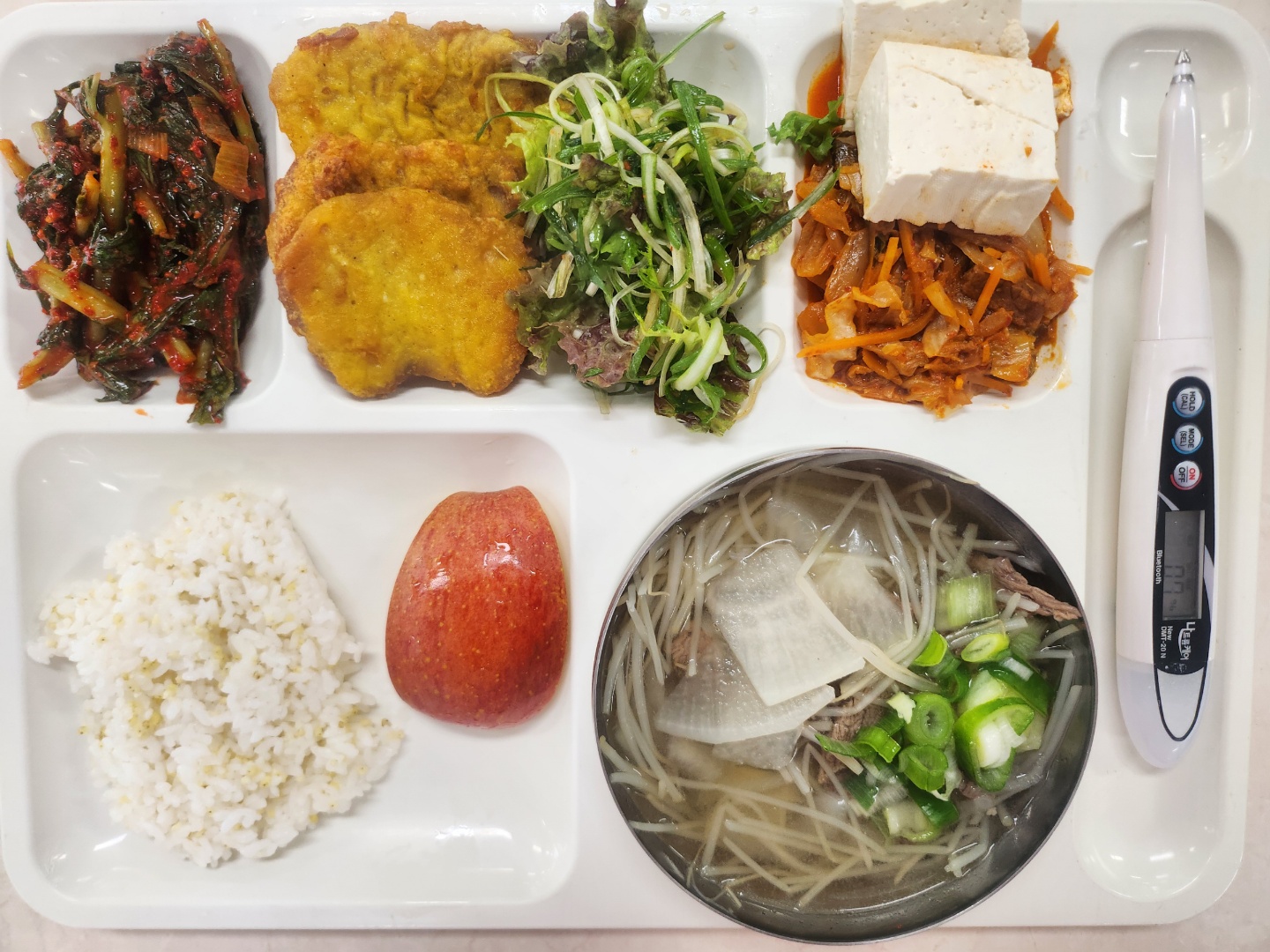 기장밥 맑은소고기무국(5.8.9.16.18) 상추대파채겉절이(13) 돈육전구이(1.2.5.6.12.15) 두부/김치볶음(5.9.13) 열무김치(9) 사과(부사)
