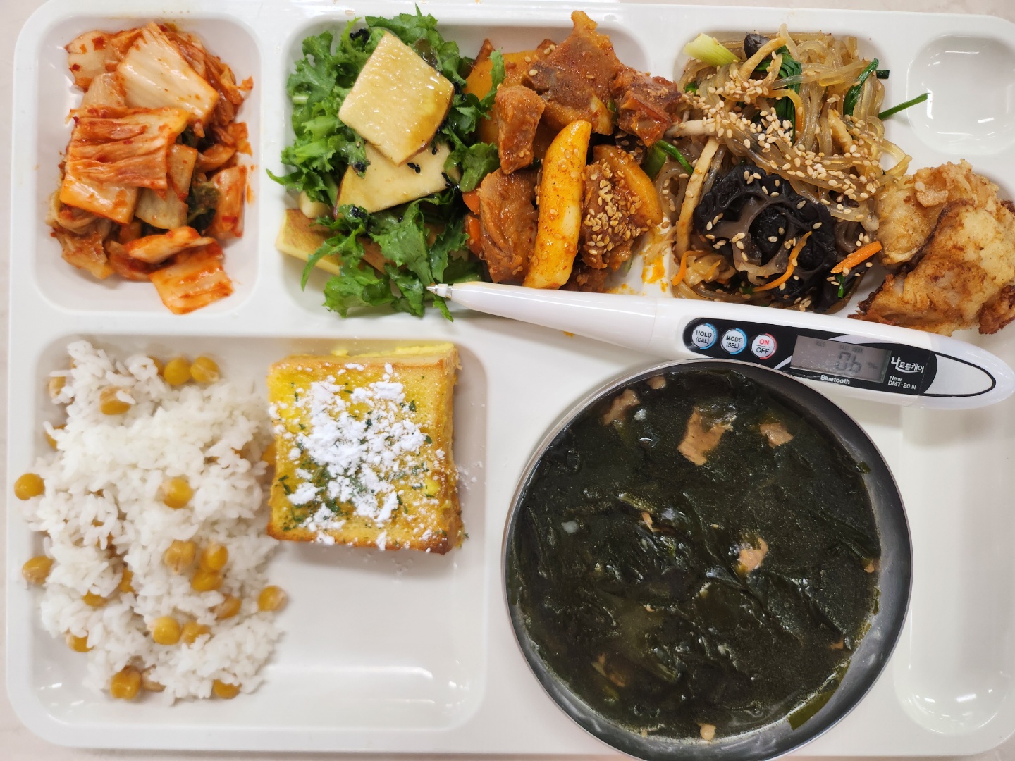 병아리콩밥 한우미역국(5.6.8.9.16.18) 돼지갈비찜1(5.6.10) 사과치커리샐러드(1.2.5.6.13) 한식잡채24(1.5.6.10.13) *적어구이(자율)30g 사각프렌치토스트(1.2.5.6.13) 배추김치(완제)(9)