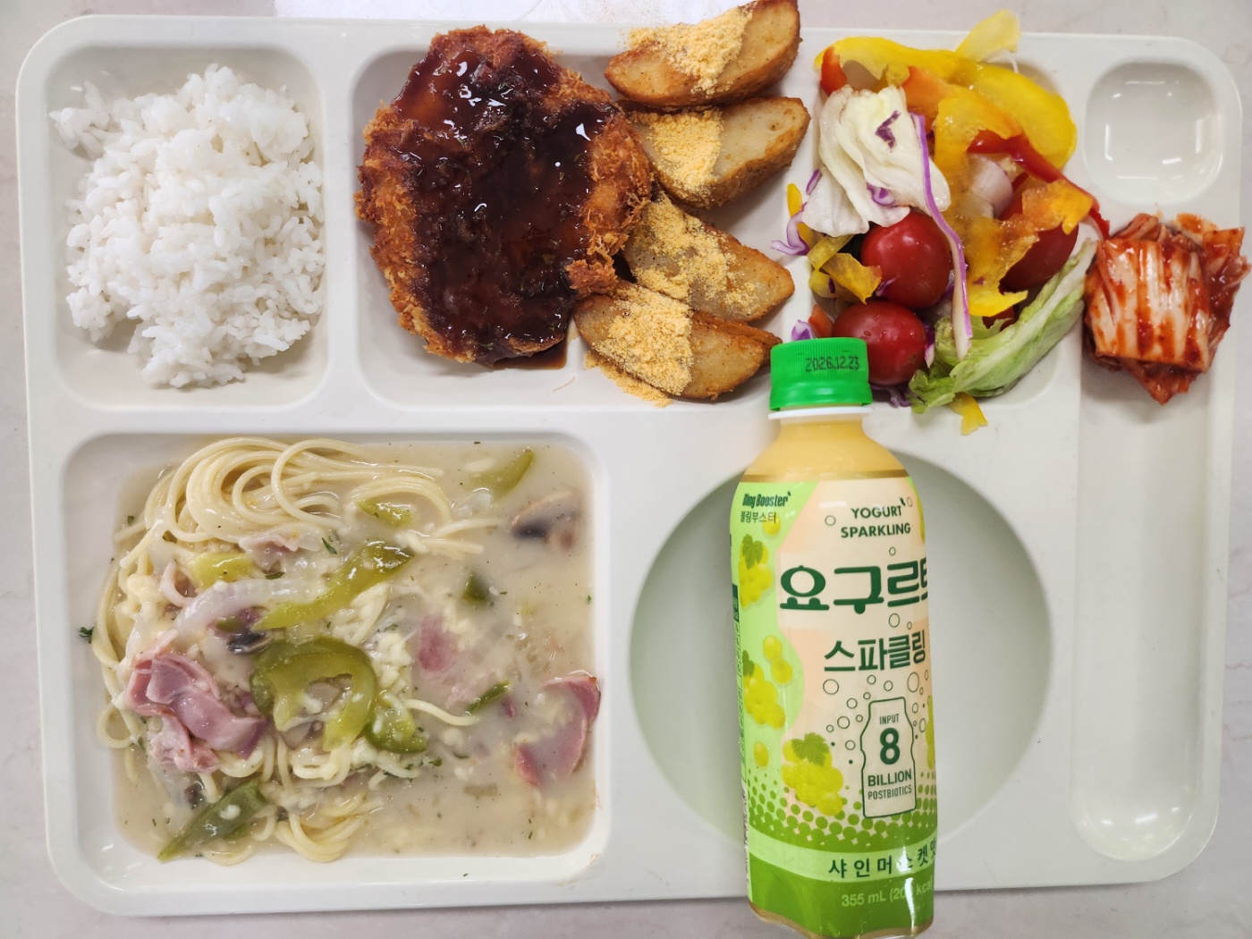 미니밥 까르보나라스파게티(주식)23(1.2.5.6.10.13) 그린샐러드(1.2.5.6.12) 등심생가츠+소스(1.5.6.10.12.13.18) 양념웨지감자(5.6) 배추김치(완제)(9) 요구르트스파클링(2)