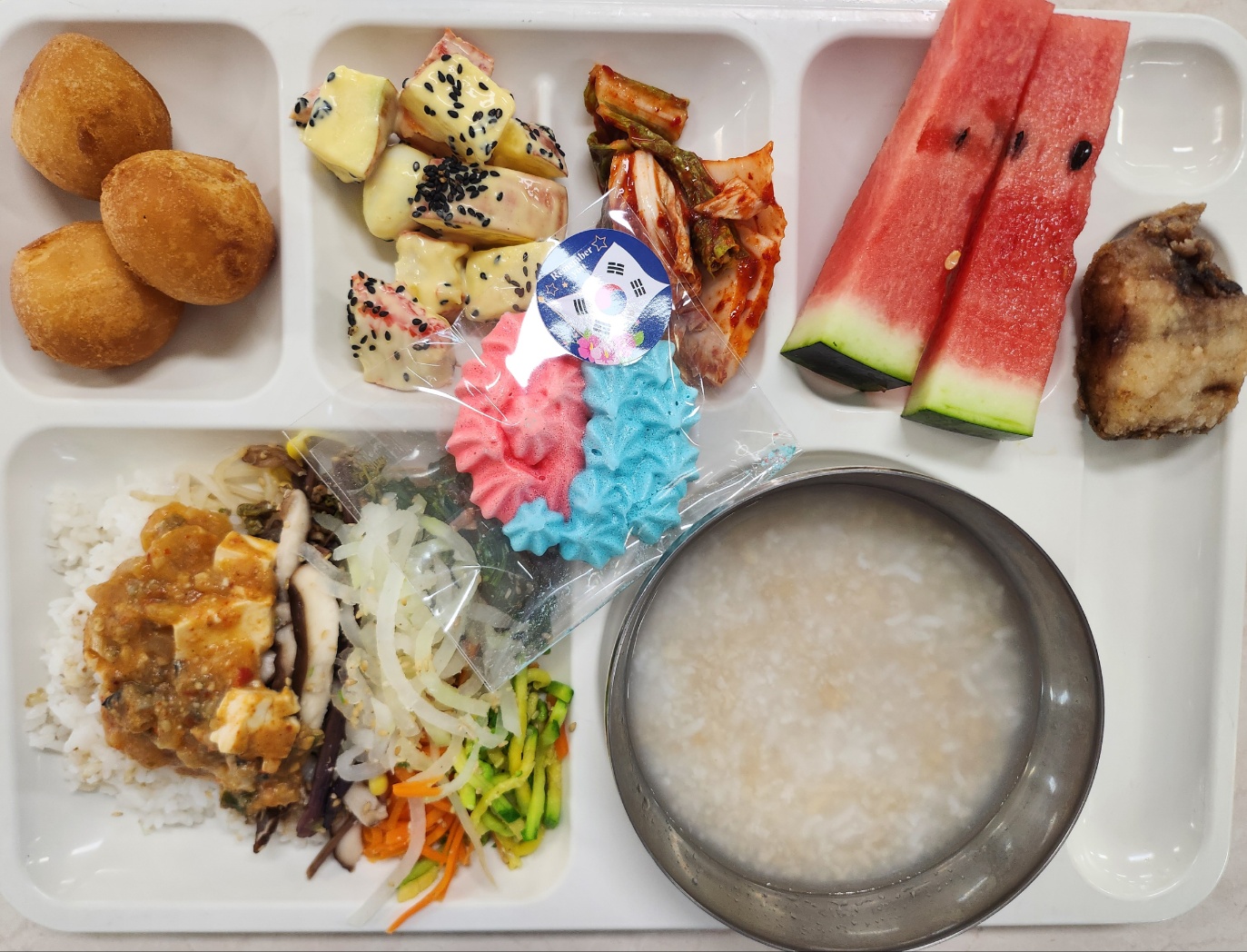 보리밥+나물비빔밥25.6(5) 숭늉(자율) 우렁이살양념장(5.6.13) 꽃맛살샐러드(브로X)(1.2.5.6.8.18) 치즈볼3개(1.2.5.6.17) 임연수어구이1자율(5.6) 배추김치(완제)(9) 수박(지원센터) 머랭쿠키(1.2.4.5.6)