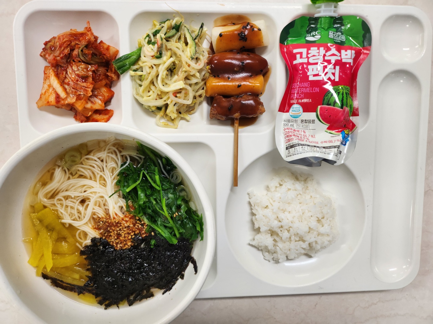 자율밥 촌국수(5.6.8.9.18) 숙주맛살냉채(1.2.5.6.13) 소&갈&떡꼬치구이+소스(5.6.10.12.13.15.16) 배추김치(완제)(9) 수박펀치음료(13)