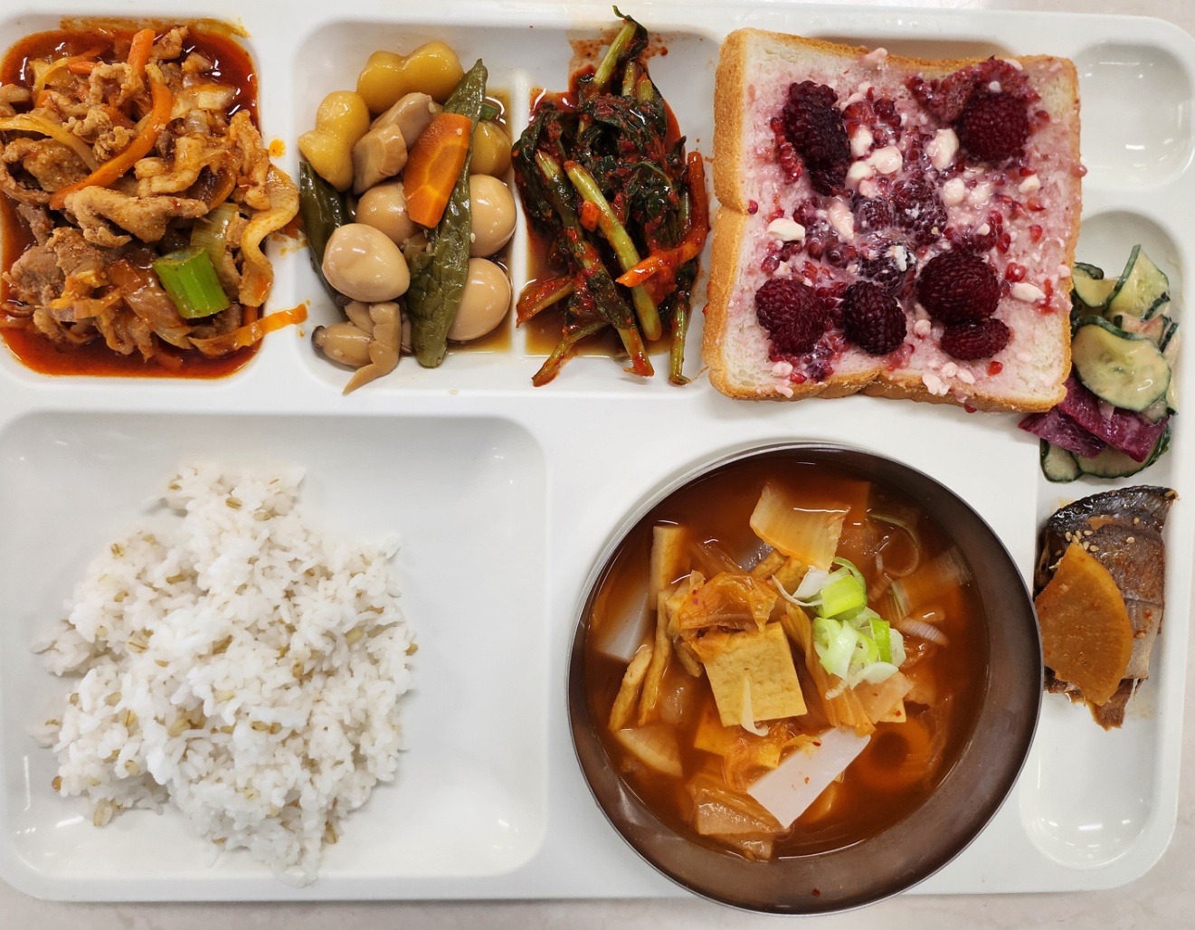 보리밥 딸기오픈샌드위치(2.5.6.13) 김치어묵국(1.5.6.8.9.13.18) 병어조림(자율) 메추리알장조림(1.5.6.13) *오이샐러드(자율)(1.5.6.13) 제육불고기(5.6.10.13) 열무김치(9)