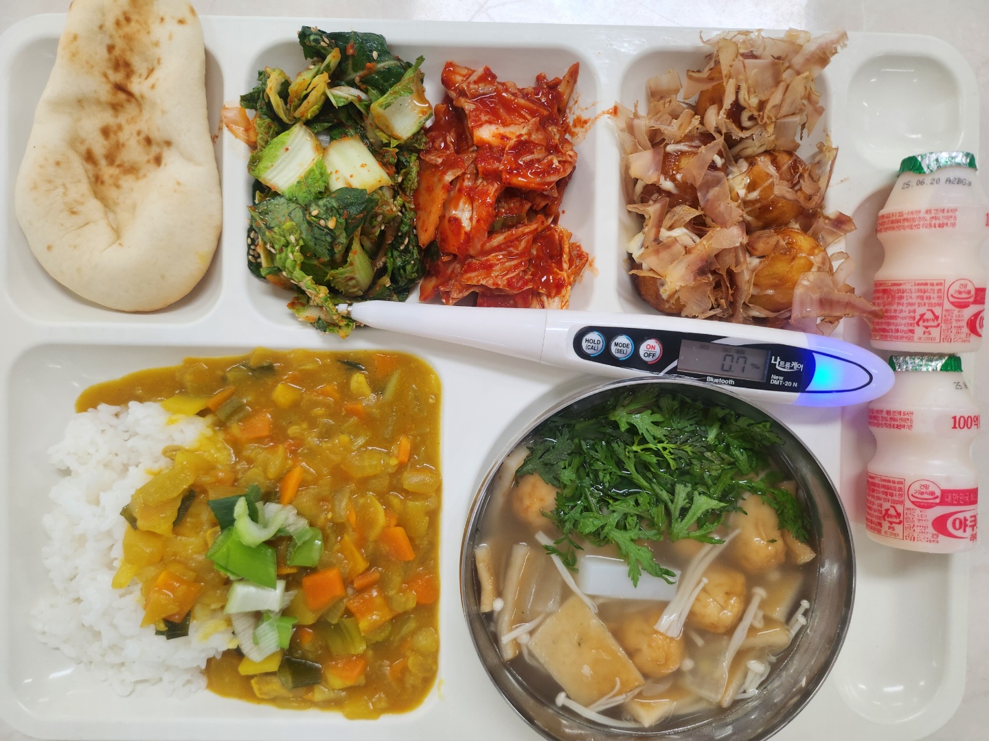돈육카레라이스(2.5.6.10.12.13.16) 쑥갓어묵국21(1.5.6.8.9.13.18) 단배추겉절이(13) 타코야끼25(1.2.5.6.12.13.18) 인도스몰난 배추김치(완제)(9) 야구르트100ml(2)