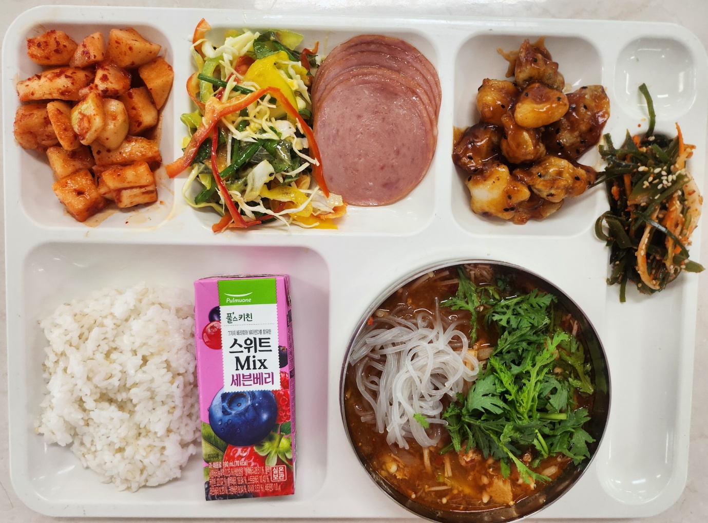 현미밥 와촌돼지찌개(10) 다시마채무침 만두떡강정(1.4.5.6.10.12.13.16.18) 쌈싸먹는오리+비빔야채(1.5.6.13) 깍두기(9) 베리음료190ml