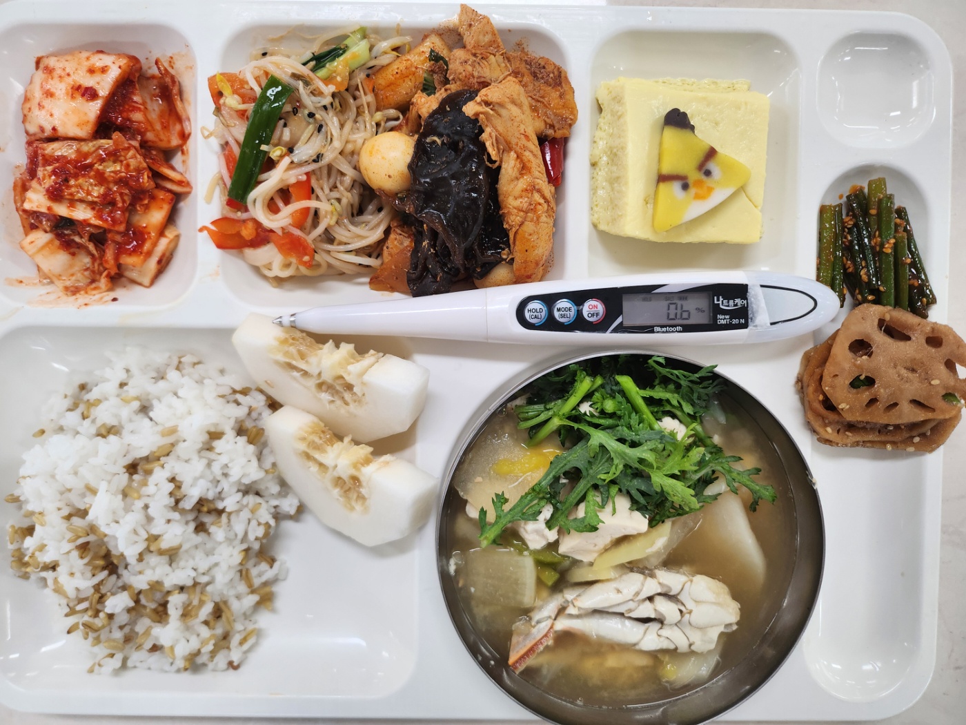귀리쌀밥 쌀국수샐러드(5.6.12.13) 꽃게된장국1(5.6.8.9.18) 연근곤약조림(자율)(5.6.13) 일식계란찜24(어묵)(1.5.6.13) 마늘쫑고추장(5.6.13) 마라샹궈찜닭(납작당면)(1.5.6.12.13.15.18) 참외(지원센터)
