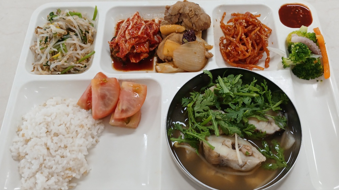 보리밥 동태국1(5.6.8.9.18) 안동식찜닭(5.6.13.15) 토마토꿀절임(12.13) 브로콜리낙지초회(5.6.13) 미나리숙주나물 일미채무침1(5.6.13.17) 배추김치(완제)(9)