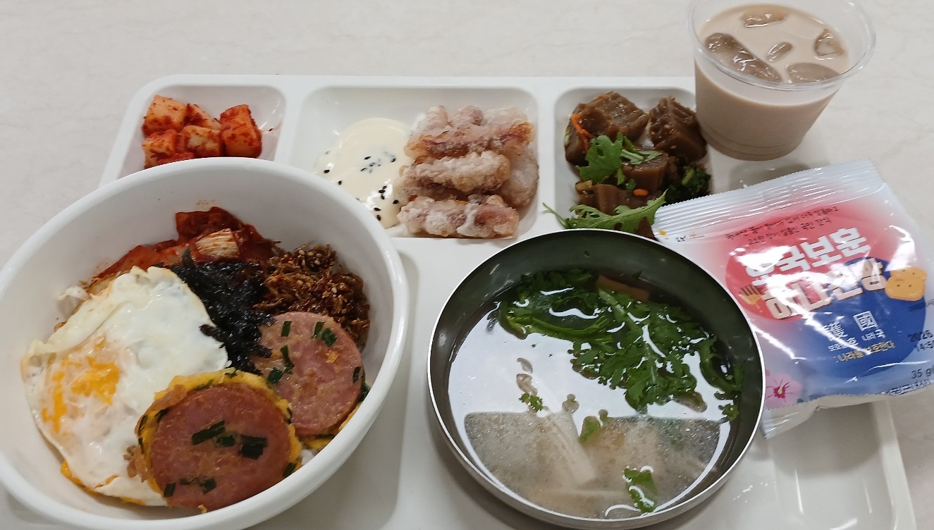 추억의도시락비빔밥(大)(1.2.5.6.9.10.15.16) *쑥갓어묵국(자율)(1.5.6.8.9.13.18) 도토리묵무침(자율)(5.6.9.13) 찹쌀오징어튀김(1.5.6.17) 깍두기(9) 꿀건빵(2.5.6) 미숫가루라떼23(2.5.13)