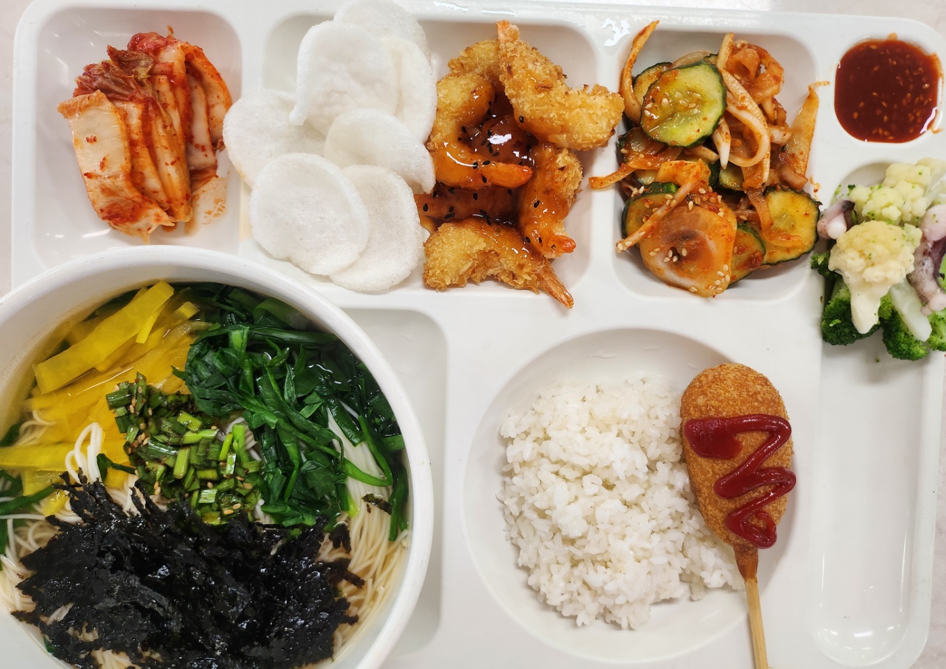 촌국수(5.6.8.9.18) 오이생채(13) 코코쉬림프+알새우칩+칠리소스(1.2.5.6.9.12.13) 배추김치(완제)(9) 치즈핫도그50g+케첩(1.2.5.6.10.12.16) *브로콜리숙회(콜리플라워자율)(5.6.13)
