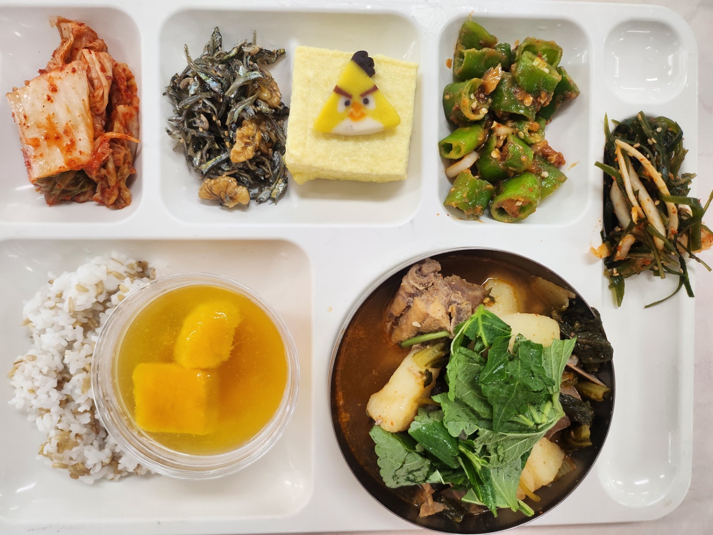 귀리쌀밥 등뼈감자탕1(10) 일식계란찜24(어묵)(1.5.6.13) 견과류멸치볶음1(13.14) 배추김치(완제)(9) 수제망고에이드(13) 아삭고추된장무침(5.6)