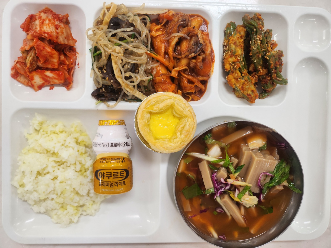 강황찹쌀밥 도토리냉국(냉)(5.6.8.9.16.18) 한식잡채24(1.5.6.10.13) 주꾸미야채볶음(2.5.6.8.9.13.17.18) 에그타르트(1.2.5.6) 배추김치(완제)(9) 야구르트100ml(저당)(2)
