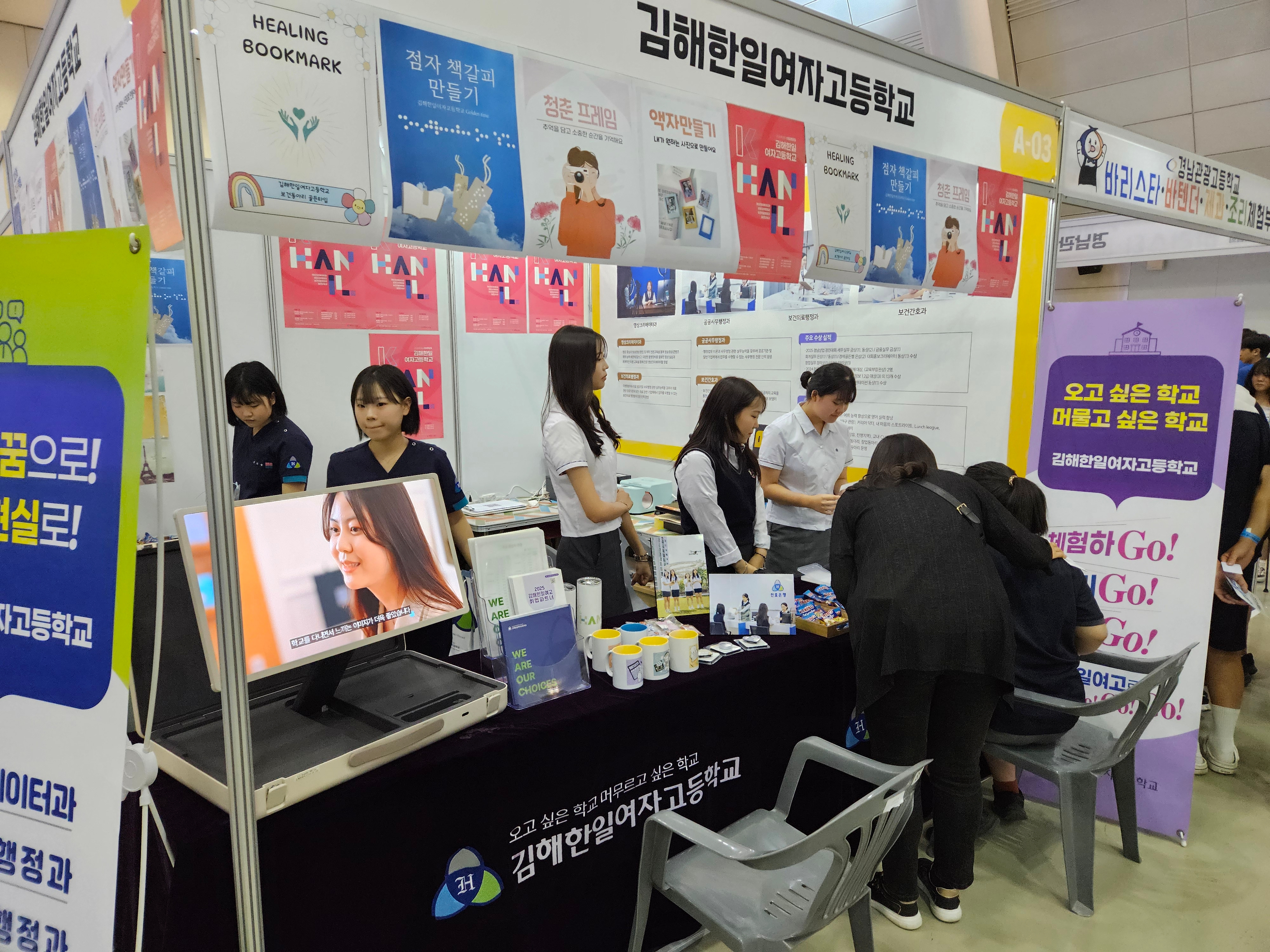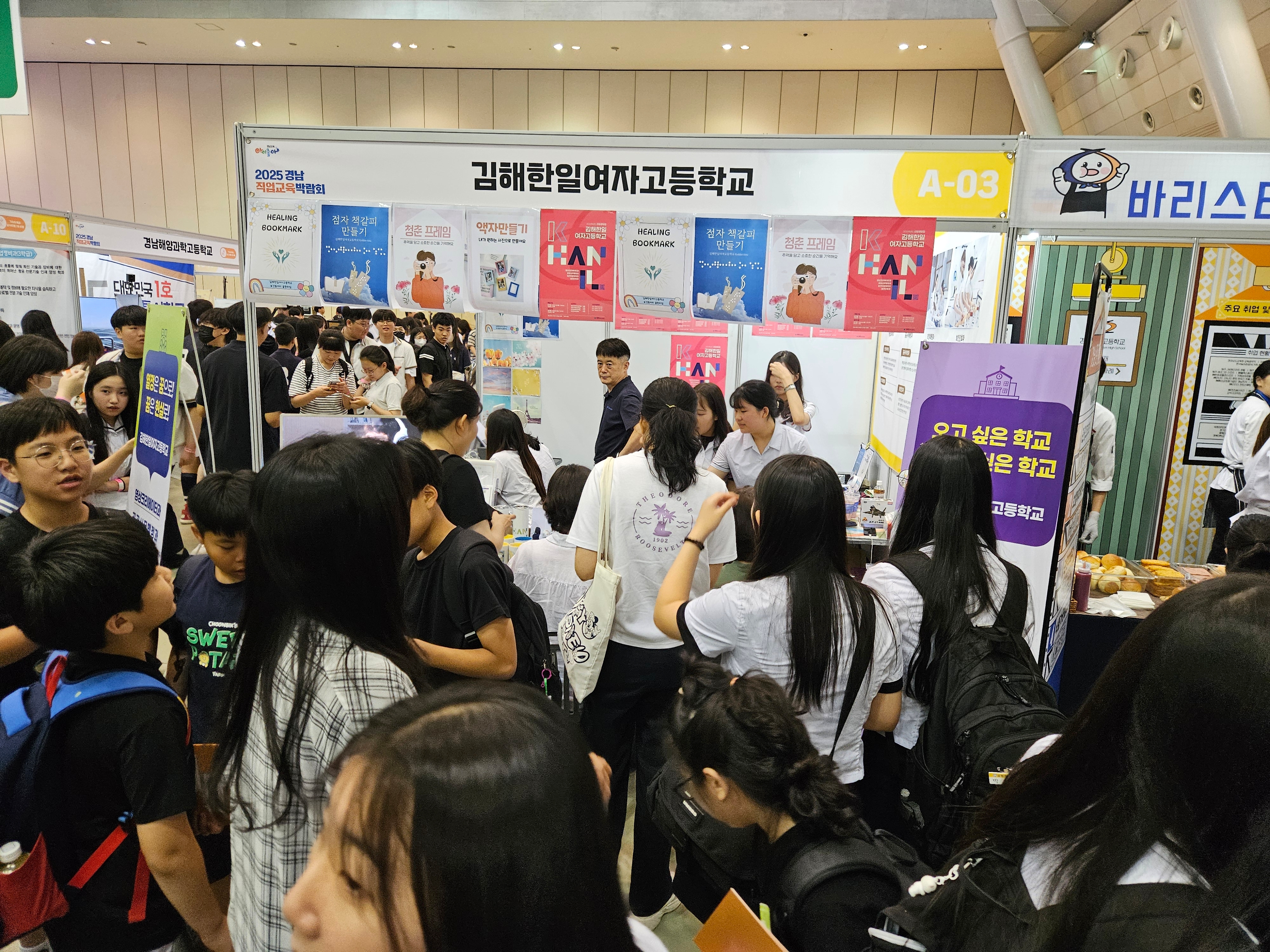 1. 행사명: 2025. 경남직업교육박람회(슬로건: “직업교육, 나의 미래를 설계하다”) 2. 행사 목적: 초·중·고등학생, 학부모, 일반인 대상 글로벌 신기술·신산업 분야 학생 맞춤형 직업 체험으로 직업계고 인식 개선 및 취업률 제고 3. 일시: 2025년 7월 10일(목) ~ 7월 11일(금) 10:00 ~ 17:00 (2일간) 4. 장소: 창원컨벤션센터(CECO) 제1전시장 5. 행사내용 1) 영상크리에이터과 <청춘 프레임> 2) 상업과 <굿즈 창업 체험-액자만들기> 3) 보건간호과 <손끝으로 전하는 마음 점자 책갈피 만들기 체험> <마음 힐링 책갈피 만들기>
