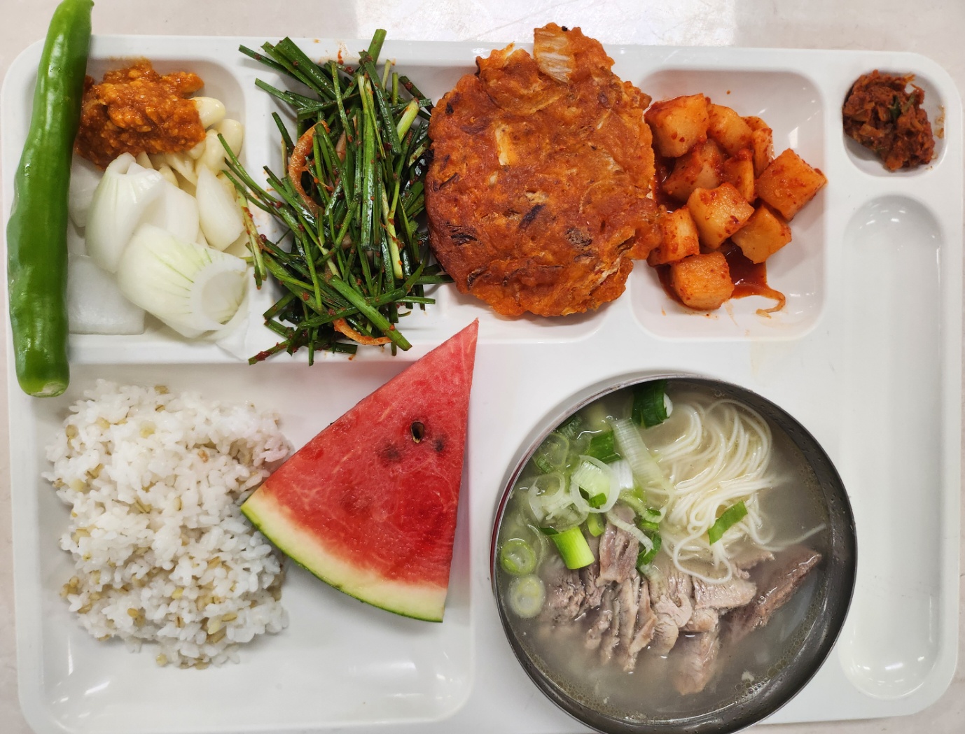 보리밥 돼지국밥+소면사리(5.6.9.10) 국밥양념장(다데기)(5.6.9) 오징어김치전(5.6.9.17) 깍두기(9) 부추겉절이 수박 *야채스틱(적양파,아삭고추)쌈장(5.6.13)