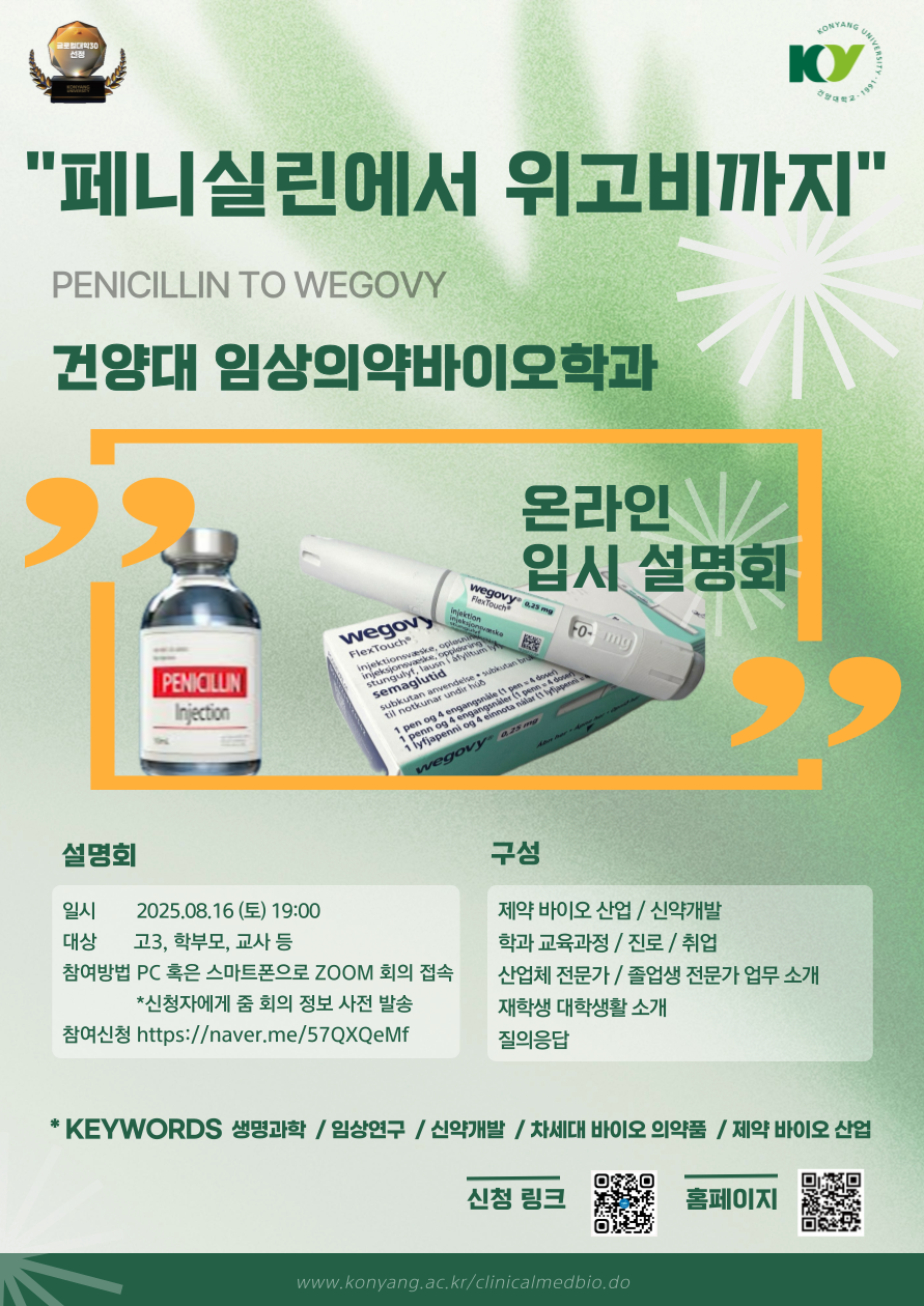 건양대학교 임상의약바이오학과 "페니실린에서 위고비까지" 온라인 입시 설명회 개최 안내