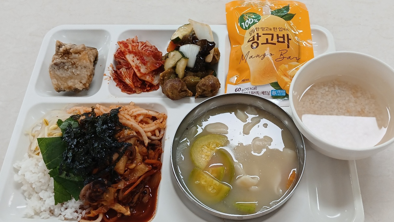 감자수제비국(5.6.8.9.18) 불맛주꾸미덮밥(5.6.12.13) 채식만두탕수(1.5.6.10.12.13.16.18) 임연수어구이1자율(5.6) 배추김치(완제)(9) 아이스망고바60g/스틱