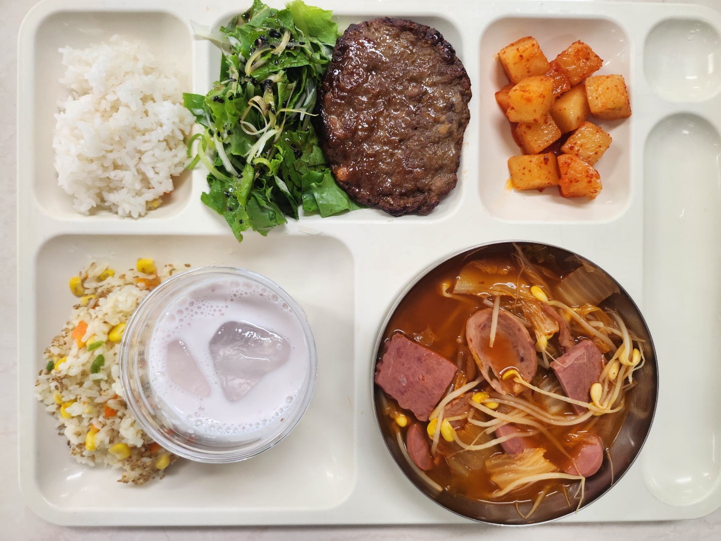야채새우볶음밥(9.13) 부대찌개25(1.2.5.6.8.9.10.15.16.18) 상추대파채겉절이(13) 전통떡갈비+소스(5.6.10.15.16.18) 딸기라떼(2.13)