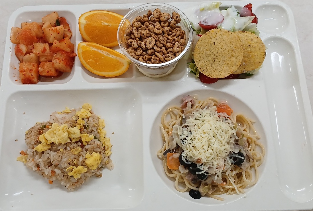 대게살볶음밥(1.5.6.8.13.18) 까르보나라스파게티(부찬)(1.2.5.6.10.13) 나쵸샐러드(1.2.5.6.12) 깍두기(9) 오렌지 조리퐁라떼(1.2.5)